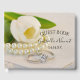 Personalisieren Sie das elegante White Tulips, Rings and Pearls Spring Wedding Gästebuch für die Teilnehmer an Ihrem März, April oder Mai Frühjahrsfeier und Empfang zu unterschreiben. Dieses stilvolle Gästebuch im botanischen Stil zeigt ein Blumenfoto einer weißen Tulpenblüte, Perlenhalskette und platinumrundem Ring aus der Verlobung sowie ein Set aus Hochzeitsband.