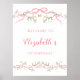 Das niedliche Begrüßungsschild (Plakat) aus dem 1. Lebensjahr ist mit einem rosa Blütenrand mit Bögen und Schmetterlingen geschmückt.