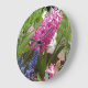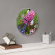 An dieser Wanduhr blühen rosa Hyakinth und lila-blaue Muscari