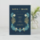 Dieses schöne Save the Date wird sicher einen Eindruck machen! Das Design ist mit einem modernen Vintagen William Morris Blumenmotiv in Blau und Gelb inspiriert, das Wort "Save the Date" in stilvollen Schriften mit einem Arch-Foto-Platzhalter auf der Rückseite.