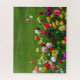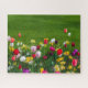 Frühlingsgrenze mit Tulpen und Narzissi mit grünem Rasen gefüllt.