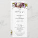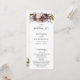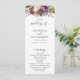 Das Frühjahrsblumen-Hochzeitsprogramm, perfekt für eine böhmische Frühjahrsfeier. Dieses Programm mit realistischen, mehrfarbigen Blume und Grünpflanzen zeigt eine atemberaubende Mischung aus lila und rosa Blüten, hellblauen und weißen Akzenten und eleganter Schriftzypografie.