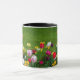 Frühlingsgrenze mit Tulpen und Narzissi mit grünem Rasen gefüllt.