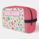 Schöne pastellfarbene Ostereier und Frühlingsblumen verstreut in einem skurrilen Muster auf der Vorder- und Rückseite dieses Toilettensacks. Ein Banner oben hat eine leicht zu bedienende Vorlage, mit der Sie Ihren Namen auf den Sack legen können. Die Seiten und die Oberseite der Tasche sind in einem koordinierenden dunkelrosa. Diese hübsche Tasche eignet sich hervorragend für Schminken oder Pflegeprodukte für eine Übernachtung.