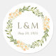 Maßgeschneiderte Gastgeschenk Hochzeit-Aufkleber/Etiketten mit Paaren/Braut- und Bräutigam-Initialen/Monogramm und Hochzeitstermin, umrahmt in einem Blumenkranz in Aquarellfarben.