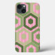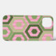 Dieses Handy Gehäuse hat ein geometrisches Design von Hexagons in vier Farbtönen grün auf einem Feld von rosa Streifen in zwei Tönen.