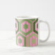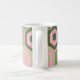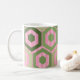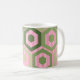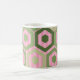Diese Tasse hat ein geometrisches Design von Sechsecken in vier grünen Farbtönen auf einem Feld von rosa Streifen in zwei Farbtönen.