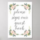 "Bitte unterschreiben Sie unser Gästebuch" mit rot-rosa Aquarellfloralen mit modernem Kalligrafieschrift.