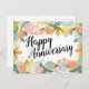 Schöne Blütenfeder in blühendem Blattwerk, mit rosa und pfirsichfarbenen Rose, verschiedenen skurrilen Pflanze und zwei viel Glück-Nelken. Liebliche "Happy Anniversary" farbenfrohe Blume Grußkarte für Ihre Freunde, Familie, Eltern oder Großeltern.
