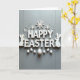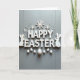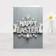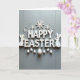 Diese Grußkarte zeigt erhabene weiße Buchstaben, die einen fröhlichen Ostergruß auf einem kühlen grauen, leicht strukturierten Holzuntergrund bilden, mit weichen Schatten, die die Nachricht nah und einladend wirken lassen. Die Buchstaben haben eine sanft abgenutzte Oberfläche, was einen gemütlichen, bewohnten Touch hinzufügt, ohne überladen auszusehen. Zwei einfache weiße Kaninchensilhouetten sitzen nahe dem unteren Teil des Textes, angewinkelt wie ein süßes Paar, das einen stillen Moment teilt 🐰. Über dem Text sind zarte, kristallähnliche Formen und winzige runde Perlen wie ein leichter Streusel verteilt, was Glanz hinzufügt, ohne das Design zu überladen 🌷. Eine ordentliche Reihe weißer Eier ruht unter der Nachricht, jedes mit feinen Flecken versehen, die wie winzige Sterne aussehen. Der Text ist zentriert und strahlend weiß vor geschichteten Grautönen, was ihn leicht lesbar macht, während der Gesamteindruck ruhig und romantisch