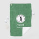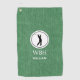 Schwarze Silhouette des Manngolfers in einem runden weißen Rahmen mit Initialen und Namen, auf einem grünen denim Druck Golf Handtuch. Personalisieren Sie die Initialen und den Namen, um ein einzigartiges Golfgeschenk zu schaffen und zu behalten. Sie können die Initialen in einen größeren Namen umkehren und den kleineren Namen entfernen. Verwenden Sie die einfache Vorlage, um den Text zu ändern und ihn zu Ihrem eigenen zu machen. Abmessungen: 16" x 24", 80% gewebtes Polyester/ 20% Polyamid Mikrofaser, Kräuterkrümel und geblasenen Haken inklusive. Waschmaschinenfest.