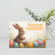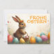 Ein niedlicher Osterhase mit einer Blumenkrone sitzt liebevoll inmitten von Ostereier. In seinem Pfoten tragend ein Klein Weidenkörchen mit bemalten Eiern. Die Szene ist von zarten Frühlingsblumen und warm em Licht umgeben. Über dem Hasen leufrisiert fröhorange Aufschrift "Frohe Ostern"- ein herzlicher Gruß, der die Leichtigkeit und Freude des Frühlingsfestes.