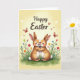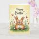 Dieses Design zeigt zwei kaninchenähnliche Charaktere mit weichem braunem Fell und langen Ohren, die sich in der unteren Mitte kuscheln, ihre Nasen berühren sich, als würden sie einen ruhigen, liebevollen Moment teilen 🐰. Ein schwaches rosafarbenes Erröten auf ihren Wangen und die Art, wie ihre Pfoten aneinander ruhen, deutet auf Freundschaft mit einem Hauch von Romantik hin. Sie sitzen in einem dichten grünen Grasbüschel voller kleiner Wildblumen in Blau, Gelb, Rosa und Orange, wie eine Frühlingswiese, die sich um sie herum öffnet 🌷. Der Hintergrund verblasst nach oben in ein hellgelbes Leuchten mit verstreuten Lichtkreisen, die sonnenbeschienenen Flecken ähneln, die in der Luft schweben. Einige orangefarbene Schmetterlinge mit roten Akzenten flattern über den oberen Bereich, führen das Auge zur Grußbotschaft. Die Hauptbotschaft ist nahe der oberen Kante in