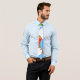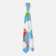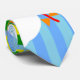 Diese Krawatte hat ein geometrisches Design von Drachen, die in den Wolken eines blau gestreiften Himmels fliegen. Es ist sehr farbenfroh und festlich.