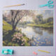 Dekopapier mit einem rosa blühenden Baum neben einem Fluss. Ein schönes Frühjahr inspirierte Landschaft in großer Größe für Möbeldekutationsprojekte.