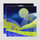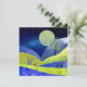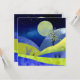 Eine abstrakte Landschaft, die sanfte Hügel mit blühendem Frühlingsbaum und blühenden Pflanze und einem Mond und Sternen in Blau, Zyan, Gelb und Rosa darstellt.
