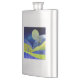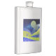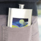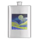 Eine abstrakte Landschaft, die sanfte Hügel mit blühendem Frühlingsbaum und blühenden Pflanze und einem Mond und Sternen in Blau, Zyan, Gelb und Rosa darstellt.