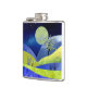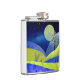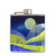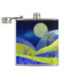 Eine abstrakte Landschaft, die sanfte Hügel mit blühendem Frühlingsbaum und blühenden Pflanze und einem Mond und Sternen in Blau, Zyan, Gelb und Rosa darstellt.