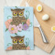 Niedliche kleine braune Eule, die zwischen pastellrosa, pfirsichfarbenen und lila Frühlingsblumen in hellblauer Umgebung sitzt
