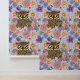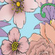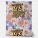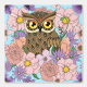 Niedliche kleine braune Eule, die zwischen pastellrosa, pfirsichfarbenen und lila Frühlingsblumen in hellblauer Umgebung sitzt