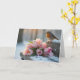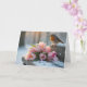Auf einer schneebedeckten Bank sitzt neben einem rosa Tulpen-Bouquet ein Rotkehlchen, der im Hintergrund einen sanften Sonnenaufgang zum Nachdenken bietet. Der Insider-Text kann geändert werden.