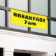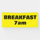 Steigern Sie Ihre Kundendaten mit diesem Banner für Frühstück maßgeschneidert Gelb Business Outdoor.  Es ist mit einem hellgelben, anpassbaren Hintergrund und fett großen schwarzen Schriften gestaltet.  Der Text lautet "Frühstück", gefolgt von einer personalisierten Zeit, die Ihr Unternehmen anfangen zu servieren.  Sie können die Wörter bei Bedarf anpassen, indem Sie auf die Option Vorlage personalisieren klicken.  Erhältlich in verschiedenen Größen.