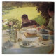 Dieses Design zeigt ein Gemälde des italienischen Künstlers Giuseppe de Nittis (1846-1884). Es zeigt eine Familie frühstücken an einem formellen Tisch im Garten. Eine Frau und ein kleiner Junge sitzen am Tisch, und es gibt einen leeren Platz, vielleicht, wo der Ehemann der Dame sitzt. Im Garten laufen Enten und Schwäne auf dem Gras, und der Junge versucht, einen der Vögel mit seinem Essen füttern. Die Familie isst aus feinen Porzellanplatten und auf dem Tisch ist weißes Leinen. Auf dem Tisch steht auch ein Strauß mit Blume aus einer Vase. Die ursprüngliche Kunst wurde 1883 von Giuseppe de Nittis gemalt.