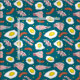 Dunkelblaue Stoffe mit einem lustigen Muster an frittierten Frühstückspeiern, Speck und Würstchen