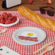 Bacon und Eier Frühstücksbüffet Party Teller. Niedliches Design für Speckliebhaber. Optional mit Text personalisieren. Grauer oder benutzerdefinierter Farbhintergrund Spaß für Geburtstagsfeier, Abendessen, Veranstaltung, Restaurant, GRILLEN, Kochkurs etc.