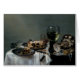 Frühstückstisch mit BlackBerry Pie von Willem Claesz Heda, Öl auf Leinwand, 1631, ist ein antikes Vintages Stillleben Gemälde eines der berühmten Meister des holländischen Goldenen Zeitalters der Malerei. Das Bild zeigt eine atemberaubend realistische Anordnung eines üppigen BlackBerry-Kuchens mit dramatisch beleuchteter Tischdecke, Silberkugel, einem großen Glas Wein. Das Bild ist in verschiedenen Farbtönen gehalten, von tiefschwarz bis hell weiß, mit hellen Reflexionen auf poliertem Silber und Glas.
