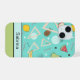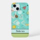 Dieses iPhone-Gehäuse mit farbenfrohen abstrakten Früchten und Memphis-Stilmustern auf blau und grün zu personalisieren. Editieren Sie einfach den Namenstext. Wählen Sie aus zwei Stilen für Apple iPhone 15 oder einer Vielzahl anderer Telefonmodelle im Drop-Down-Menü.