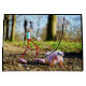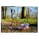 Fubby die met zijn huisdier aan de lijn loopt. Een combinatie van hond en kat. Samen in een bos omgeving tussen de bomen.