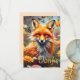 Ein hübscher kleiner Fuchs schaut dich an. Er sitzt zwischen Blumen und spielte mit Schmetterlingen.