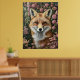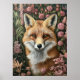 Ein schön detaillierter Fuchs blickt in die Kamera, umgeben von lebhaften rosa Frühlingsfloralen, und schafft so eine ruhige und bezaubernde Waldlandschaft.