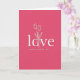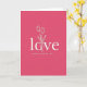 This card features a rich fuchsia background that sets a romantic, modern mood ❤️. Centered on the front, the word “love” appears in white, using a simple sans-serif style that feels smooth and confident. The letter “o” is replaced by a thin white outline of a hand gently holding three tulips, as if offering them to someone special 🥰. The tulip stems curve upward with small petals at the top, giving the design a tender, giving gesture without adding extra clutter. A faint shadow behind the white lettering and flower outline makes the elements look slightly raised from the pink surface. Beneath the main word, “HAPPY VALENTINE’S DAY” is set in smaller white capital letters, aligned under the center. The composition stays minimal and balanced, with lots of open pink space around the white art and text. The tulips are drawn in fine white lines, with three blooms sitting just above the hand inside the “o” shape.