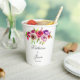 Schöne, leuchtend rosa Blume zieren diese schlichte, romantische Papiertasse für einen Hochzeitsempfang am Nachmittag in einem Garten. Das wunderschöne kursive Drehbuch wird durch eine wunderschöne, lebendige Fuchsia und lila Blumenstrauß mit Rose unterstrichen.