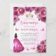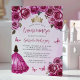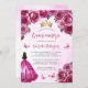 Diese schöne Quinceañera Einladung zeigt eine Grenze von fuchsienrosa Rosen auf einem rosa Aquarell Hintergrund. Eine goldene Tiara, ein dunkelhaariges Mädchen in einem fuchsienischen Prinzessenkleid und kleine rosa Schmetterlinge schmücken den Text. Das Wort "Quinceañera" und der Name des Ehrengast erscheinen in eleganter Fuchsia-Handschrift, der Rest in grau sans serif Schriftart.