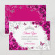 Fuchsia pink silver Quinceanera celebration thank you card. Features, script font, butterflies, watercolor roses and tiara. Perfect for an elegant princess style glam celebration. Personalize with your own details.