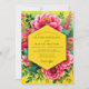 Embrace a joyful and vibrant atmosphere with this lush botanical design. A stunning arrangement of painterly fuchsia peonies and smaller blossoms pops against a radiant marigold and lime green backdrop. The artistic and saturated floral composition is perfect for a cheerful, tropical-themed affair.