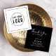 Stilvolle Verpackungs-Einsteckkarte mit Ihrem Logo und einem quadratischen schwarzen Rand auf der Vorderseite und "Danke" in modernen Kalligrafieschriften mit der Erholung Ihrer Social Media und Web-Informationen auf der Rückseite. Sie können die Hintergrundfarbe ändern, indem Sie auf den Hintergrund klicken. Personalisieren Sie es, indem Sie den Platzhalter-Text und das Platzhalter-Bild durch Ihr eigenes Logo ersetzen. Für weitere Optionen, wie zum Beispiel den Schriftart zu ändern, ist es die Größe und Abstand zwischen den Buchstaben klicken Sie auf die Schaltfläche "Anpassen". *Bitte beachten Sie, dass das Zazzle-Wasserzeichen, das in der Zoomvorschau angezeigt wird, NICHT auf dem gedruckten Endprodukt erscheint. © Rosewood and Citrus