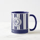 Moderne Kaffeemaschine für Friseursalon in Weiß- und Dunkelblau-Streifen mit Schere-Logo. Die Tasse ist einfach und modern. Einfach mit Ihrem Firmennamen oder Friseurnamen und Ihrem eigenen Firmenlogo personalisieren.