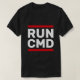 Ein geekter Computeradministrator mit einem Run Cmd T - Shirt, sitzend an einem Schreibtisch mit einem Laptop und einer Tasse Kaffee, umgeben von Informatikbüchern und Gadgets. Perfekt für jeden Nerd, der Technologie Liebe!