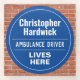 Spaß Gedenkmauergeschenk an der Wand in Form eines Glass-Untersetzer für einen Ambulanzfahrer. Blaue und weiße Plakette. Bearbeiten Sie das Design, um die Formulierung so zu ändern, dass der Empfänger des Geschenks Anzug erhält.