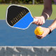 Dieses elegante, sportliche Design zeichnet sich durch PICKLEBALL-Text in klassischer Typografie aus, der in einer schräg abwärts gelegenen Schrift dargestellt wird. Der Text befindet sich am unteren Rand des oberen diagonalen schwarzen Farbblocks. Der untere Teil des Designs ist lebhaft orange und hell blau.