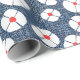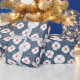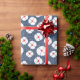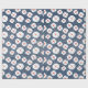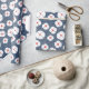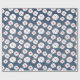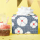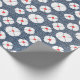 Weiße Blume mit roten Mittelpunkten auf blauem Stoff.