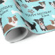 Dieses Verpackungspapier "Happy Birthday" zeigt verschiedene Bilder von Farb-Hunden an der Grenze, zusammen mit einem weißen Knochen und einem grauen Pfotendruck. Ihr Text ist in zwei Feldern enthalten, die Sie anpassen können. Alles wird auf einem himmelblauen Hintergrund platziert.