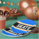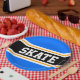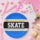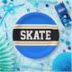 Dieses sportliche, sportliche Design mit feinem SKATE-Text in einem farbenprächtigen, schwarzen Streifen mit zwei weißen und gelben Rennstreifen gegen leuchtend blaue Außenstreifen. Der Text kann personalisiert sein.