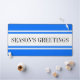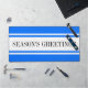 Dieses elegante, sportliche Design besticht durch einen weißen Streifen in der Mitte mit schwebenden weißen Streifen. Die äußersten Randstreifen sind hell blau, und der festliche "Grüße der Jahreszeit"-Text kann personalisiert sein.