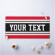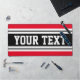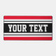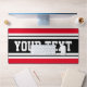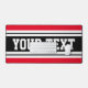Dieses sportlich-sportliche Design zeichnet sich durch fette, große Buchstaben aus, die auf die individuellen Bedürfnisse zugeschnitten werden können, in einem schwarzen, hervorgehobenen Streifen mit zwei weißen Streifen vor einem farbenfrohen, leuchtend roten Hintergrund.