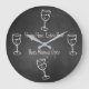 Fun Bar Thema Wanduhr in einem kohlegrauen Chalkboard-Look, mit weißen Zeichnungen von Weingläsern, an den Stunden von 12, 3, 6, und 9 Uhr. Weiße benutzerdefinierte Text liest, Happy Hour, Jede Stunde Bars immer offen, und kann personalisiert sein, zu lesen, was Sie gewollt.